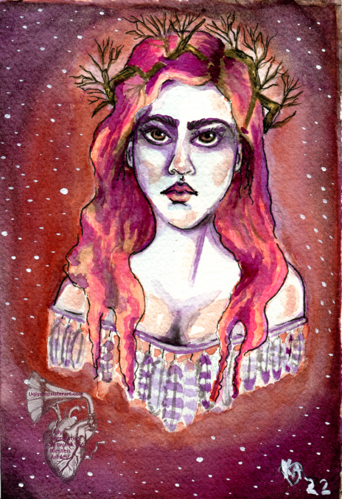 Today, July 4, the demon is Lilith. Lilith is based in Jewish folklore. In biblical lore she was made from the same clay as Adam, and was his first wife before Eve. Lilith was cast out for demanding that she was equal to Adam. (The lore varies from cheating to disobeying Adam, but the general idea is the same.) Lilith/Lilit translates from Hebrew to “night hag” or “screech owl.” There are ties to a Mesopotamian Lilith (which may or may not be related) that grew from a tree, and relates to owls. I added screech owl feathers on her collar and a crown of branches. She is described in the Zohar, Leviticus 19A as “a hot fiery female who first cohabitated with man.”