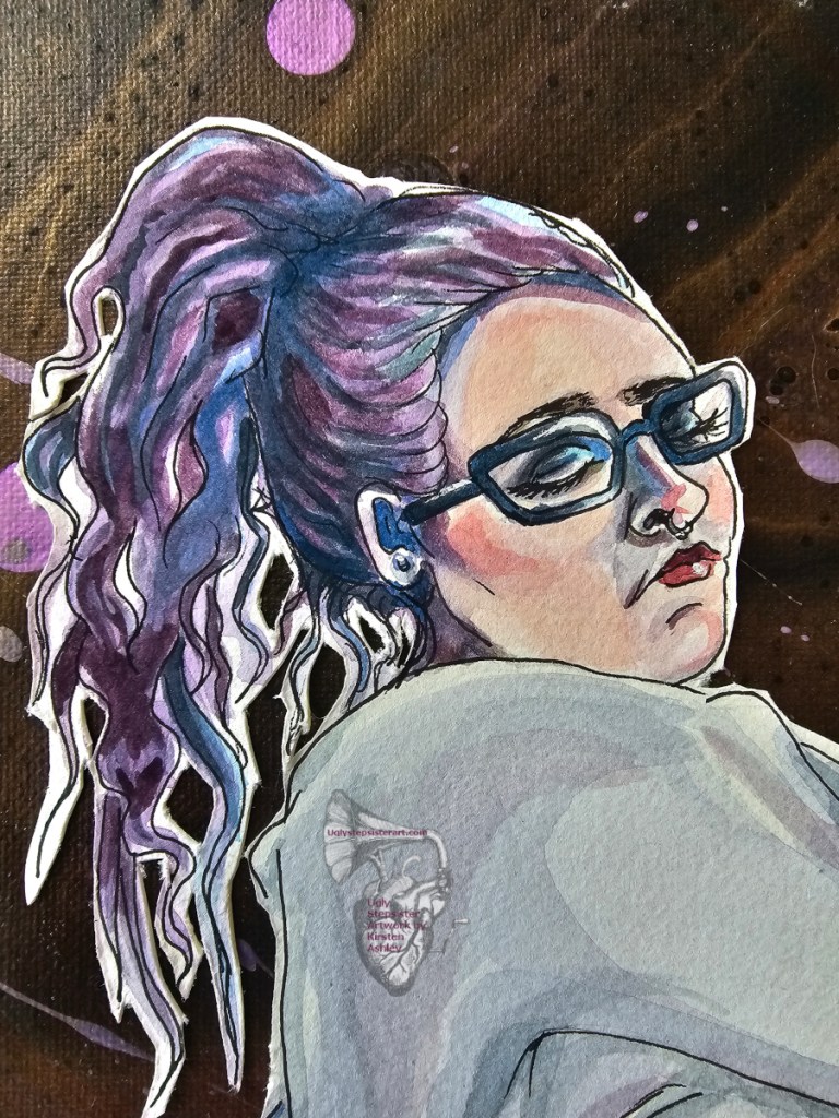 I haven’t created a true self-portrait in years. This type of artwork is important to reflect on not just yourself, but who you are in the moment. For this newest self-portrait I took on a tough and conflicting aspect of my psyche. And that is how I feel about my body. I (and many, many people) have struggled with body image issues my entire life. I have hated it and wished for different features in varying degrees since I was a teenager. It has led me to allow it to be treated with disrespect by others. This painting tackles some perceived flaws, yes, but also allowing myself to feel desired as-is with no frills- no push up bras or pretty dresses. There is a certain power and magic in finding that after so much time loathing and wanting to change my body.