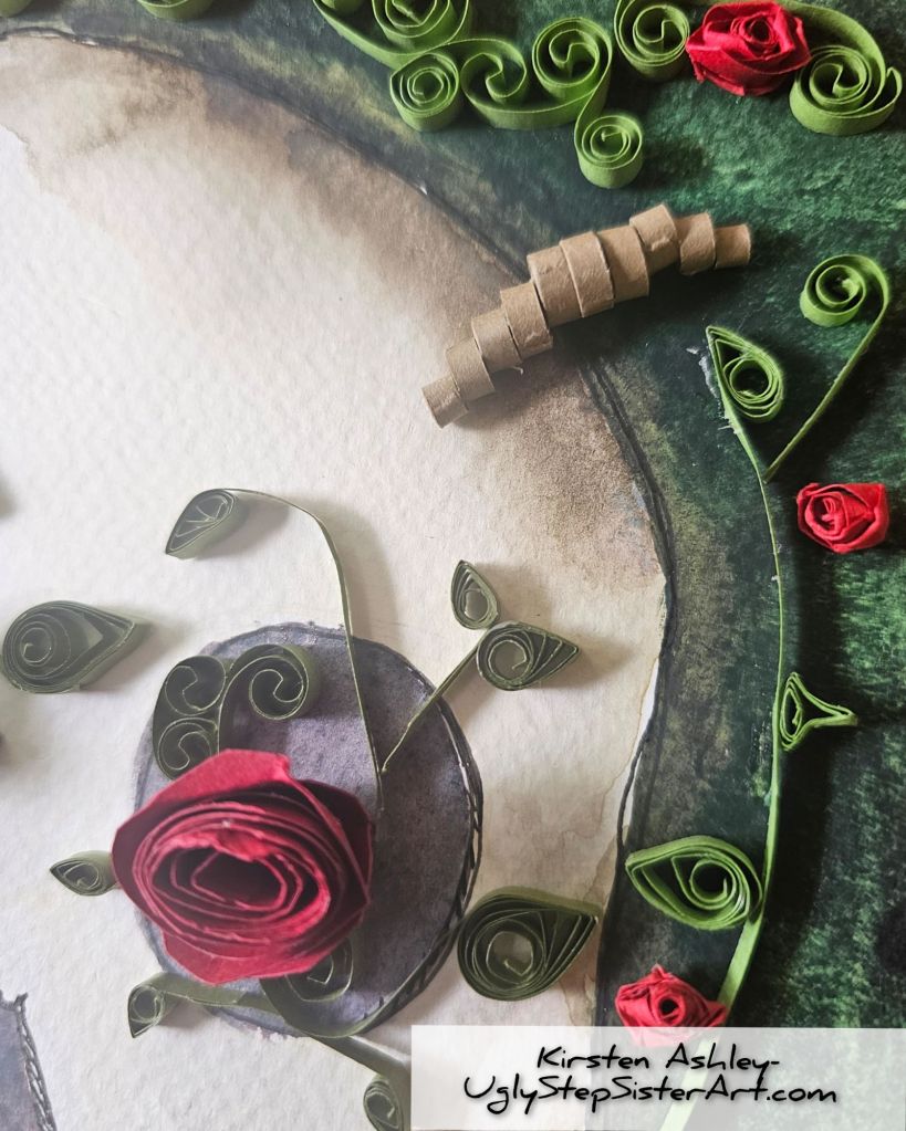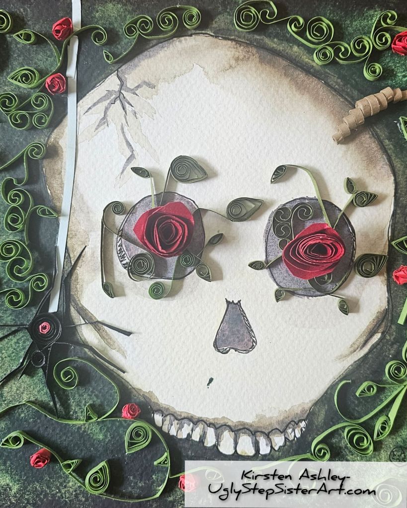 I present to you Bone & Botanicals, my first mixed media piece incorporating paper quilling. This is the final project for a quilling class I sat in on. Quilling was completely new to me, and twirling and shaping paper has become rather addictive. (I’m currently working on another quilled piece for Delaware Fun-A-Day.) By the way, this class was through my library day job, so don’t mind my married name on the name tag. Please don’t stalk me. )